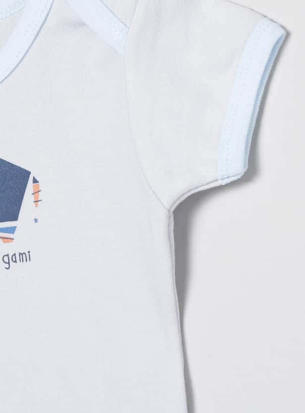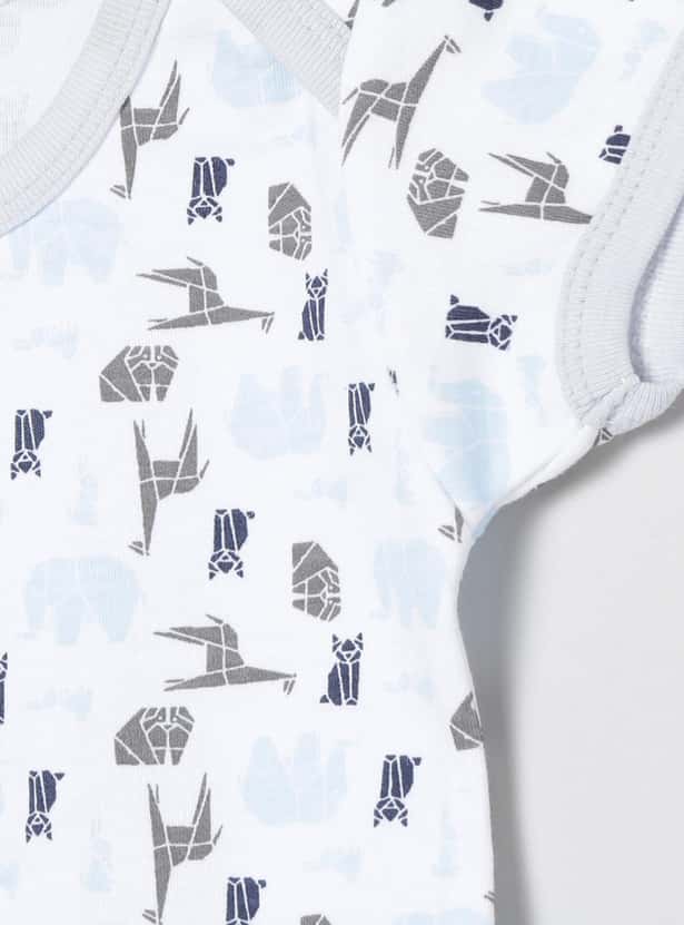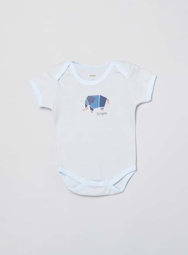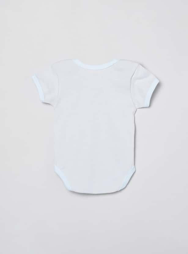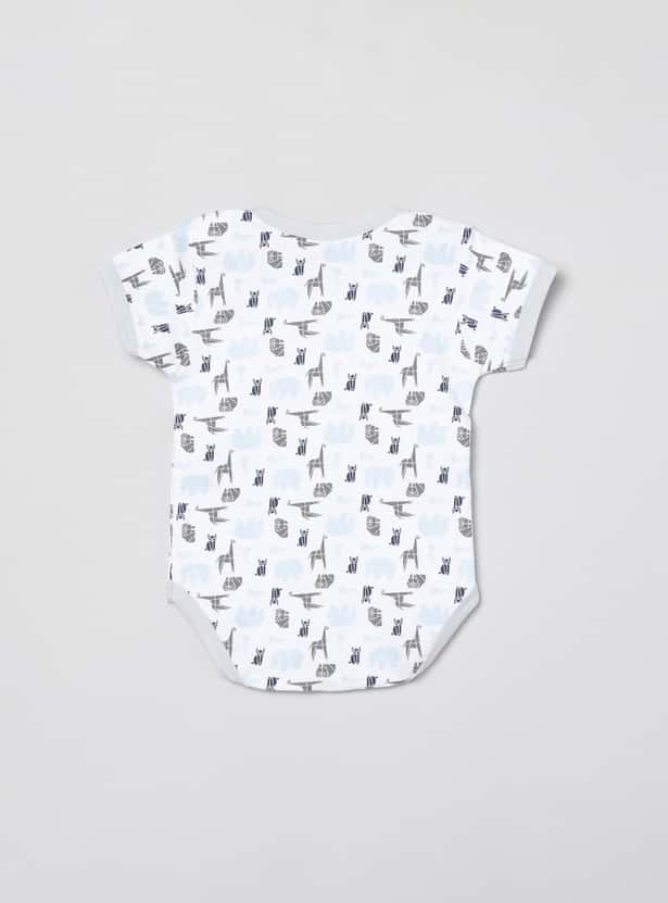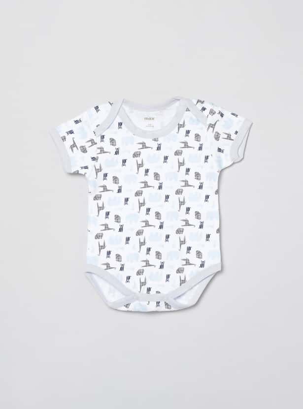 This bodysuit for babies comes with a round neck and short sleeves along with a diaper button and printed design for added comfort and look.