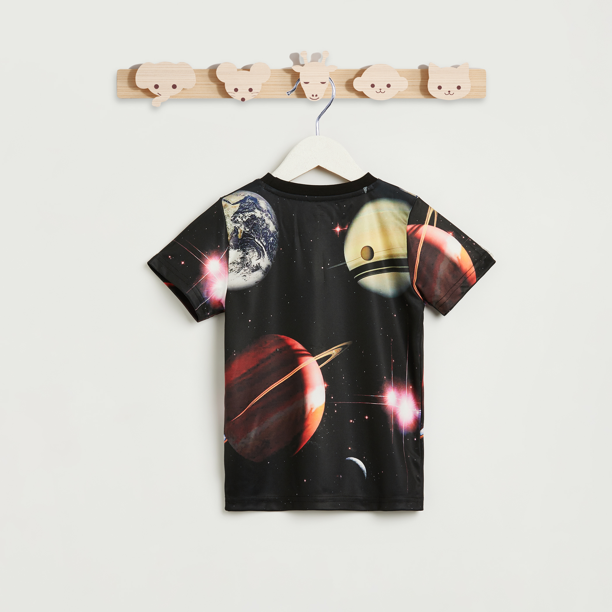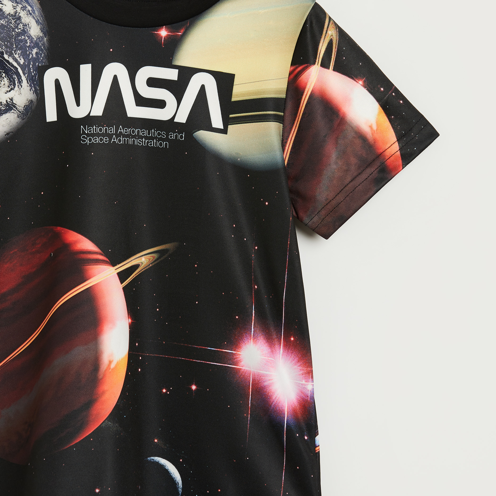 Launch into style with this space-themed NASA t-shirt, featuring a stunning galaxy print. Designed with short sleeves and a classic crew neckline for everyday comfort. Foil detailing adds a cosmic shimmer to the soft, breathable fabric.