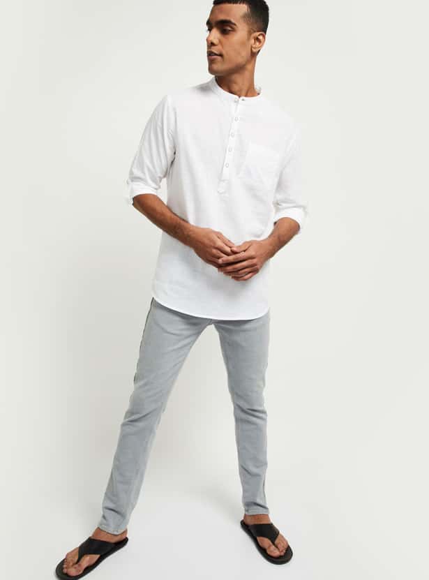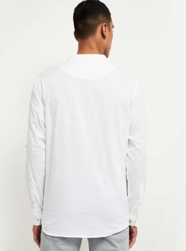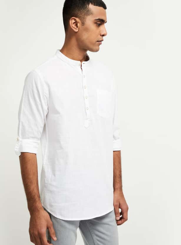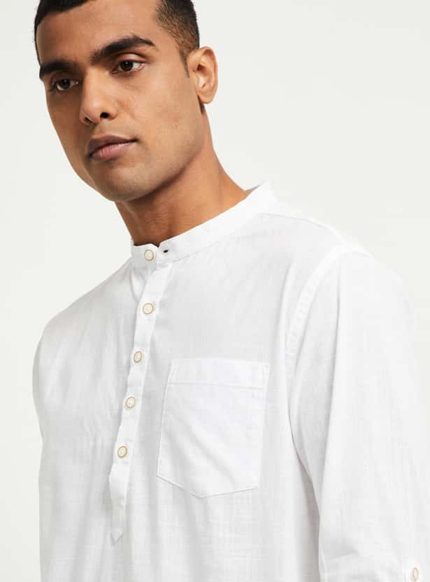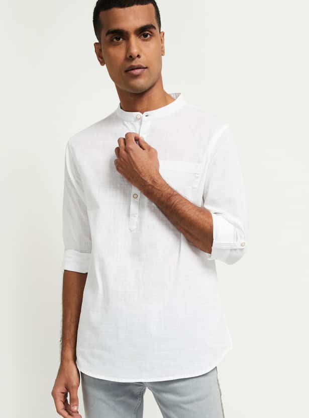 Give your look of the day an ethnic twist with this shirt kurta that features a solid surface with full sleeves, band collar and a buttoned half placket.