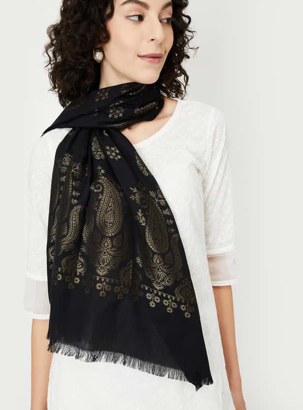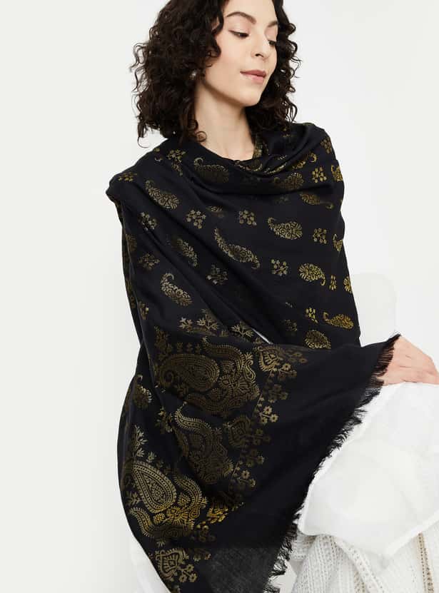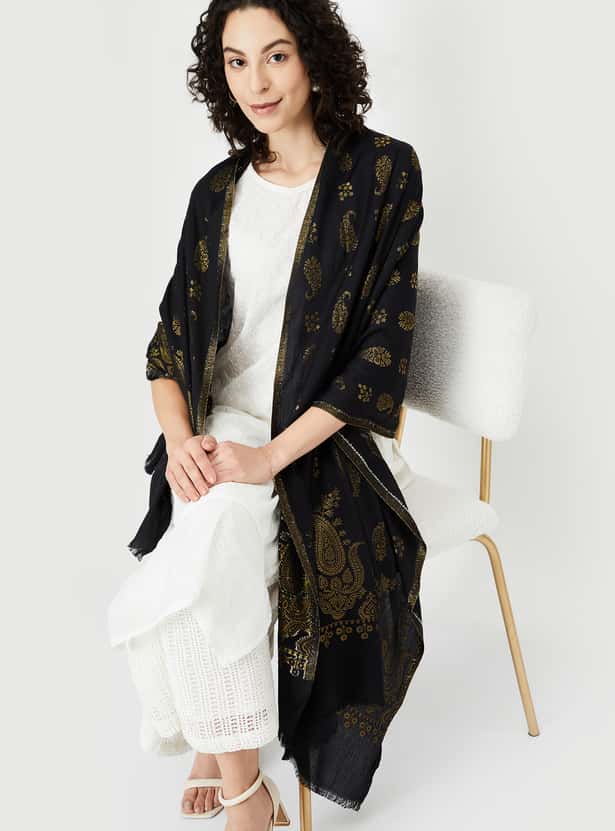 Embrace the season in style with this elegant shawl, featuring intricate woven paisley patterns and fringes at the ends. Perfect for adding a touch of warmth and sophistication to your outfit.