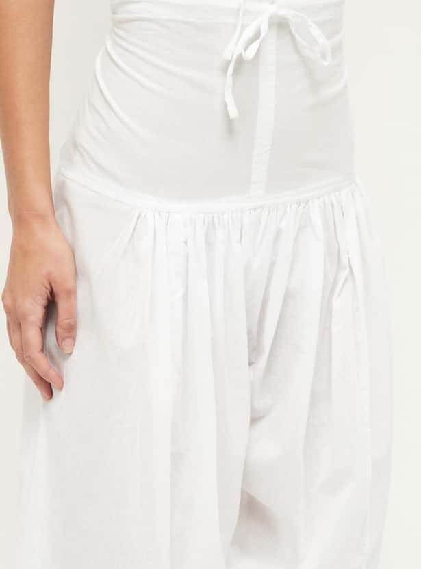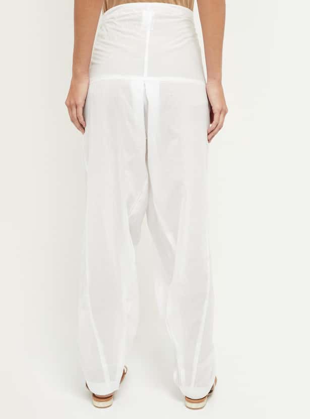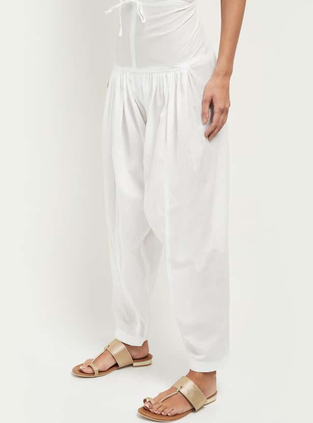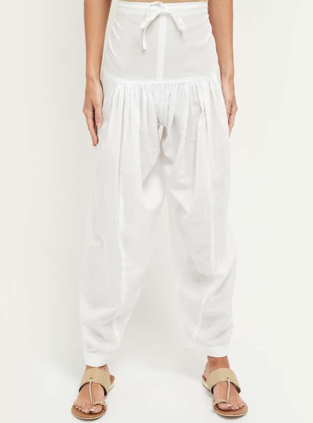This pair of solid Patiala pants are enhanced with an elastic waistline, drawstring and knife pleatings.