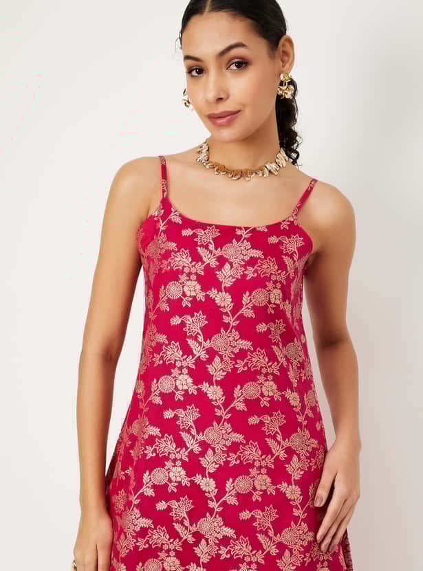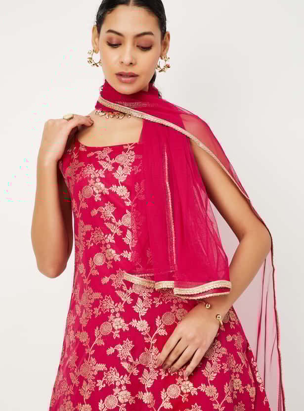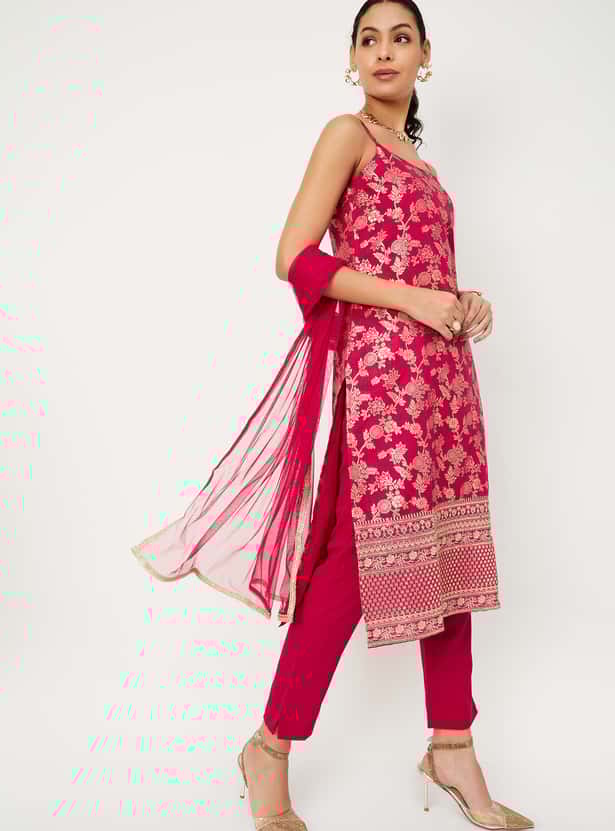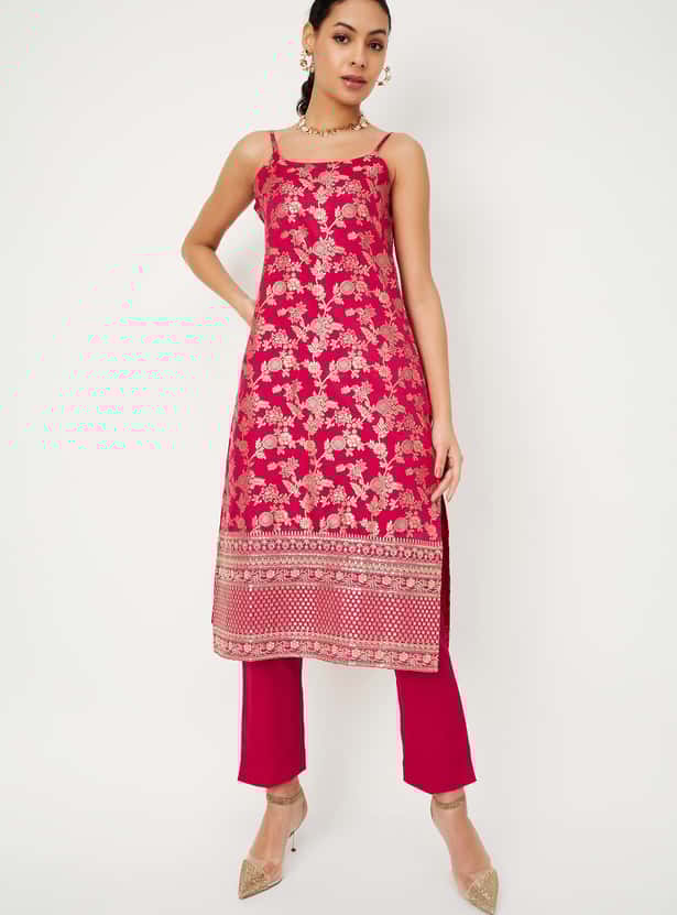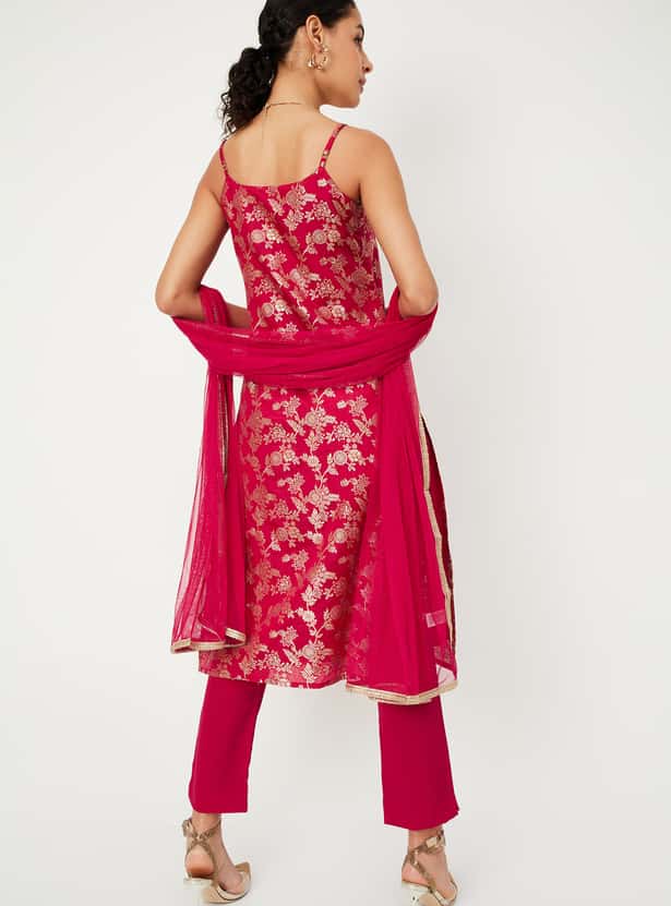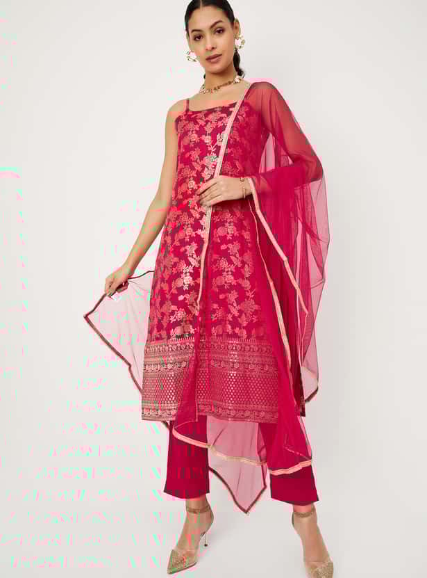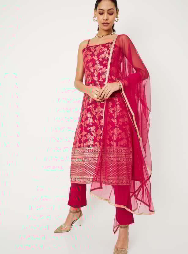 Flaunt an elegant look with this exquisite ethnic set. The woven straight kurta, featuring a scoop neck and a sleeveless silhouette, is paired with solid straight pants and a matching dupatta. This set exudes grace and sophistication, perfect for making a stylish statement on any occasion.