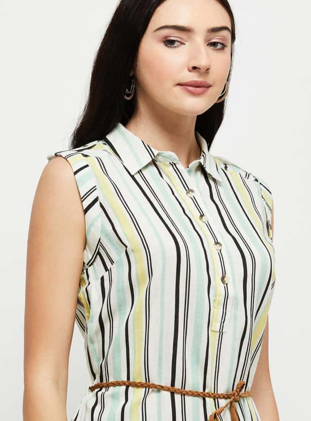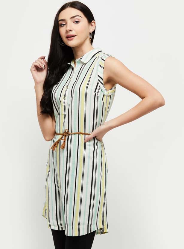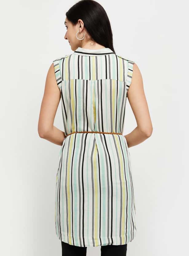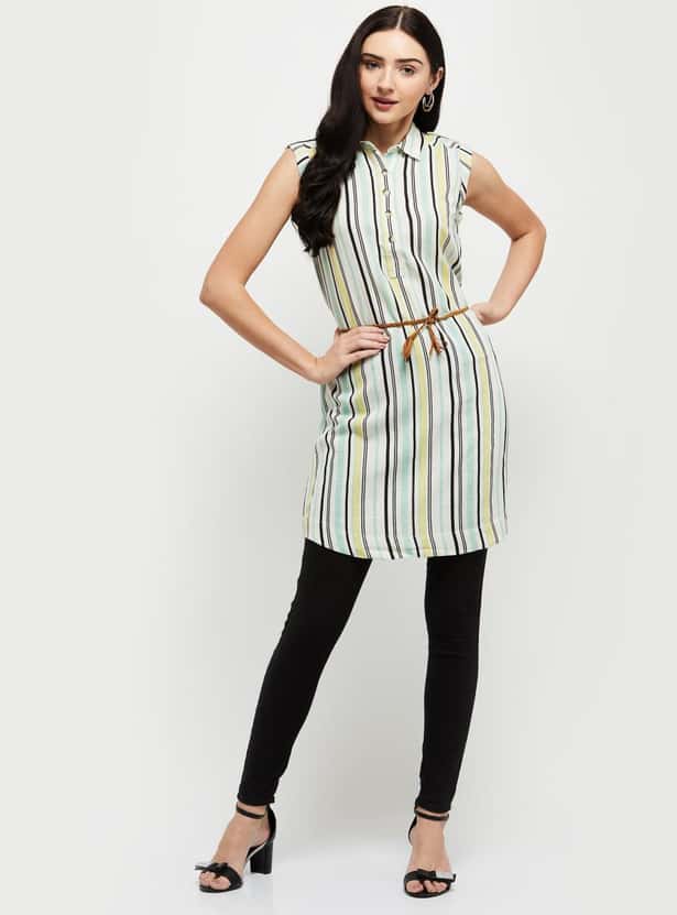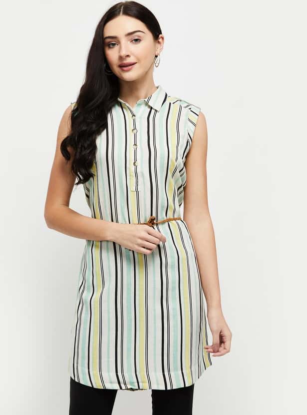 Look beyond stylish with this minimal tunic that's designed with bold stripes, tie-up detail, spread collar and a button closure.